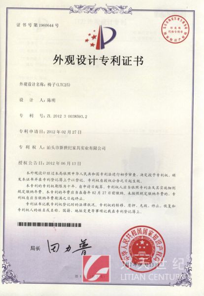 塑钢椅(NC508)外观设计专利证书